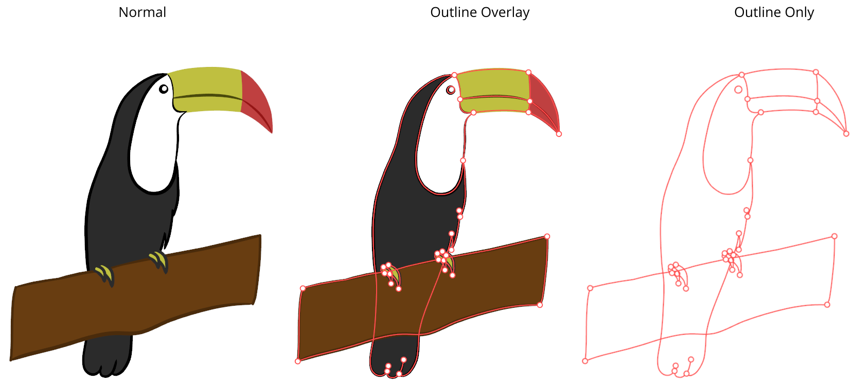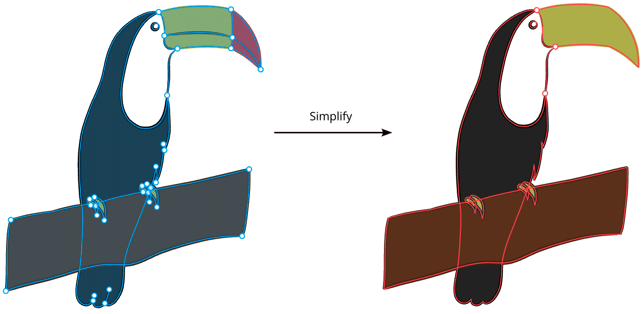 This removes all vertices and edges that can be safely removed by merging adjacent edges and faces, resulting in the same general drawing but with all inner details removed. Note that in the example below, the eye and the white area of the toucan are preserved because the white area is actually a blank/empty space, not a face. So the eye wasn’t connected to the rest of the drawing. But if the white area was actually a face, then both this face and the eye would have been removed.